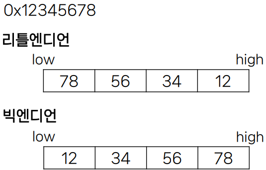 - 리틀엔디언 : 데이터의 MSB 가 가장 높은 주소에 저장된다.
