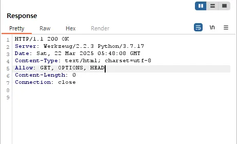 Response 를 확인해보면 허용하는 통신 옵션으로 OPTIONS, GET, HEAD 3가지가 있는 것이 확인 가능하다.
