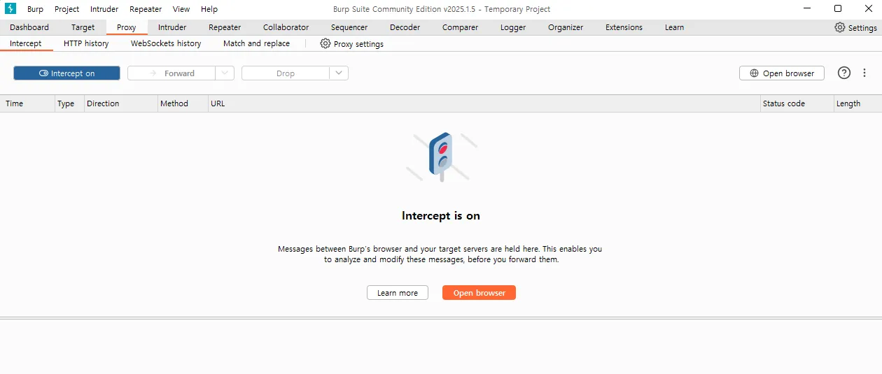 Proxy -> Intercept -> Open browser 를 클릭한다.