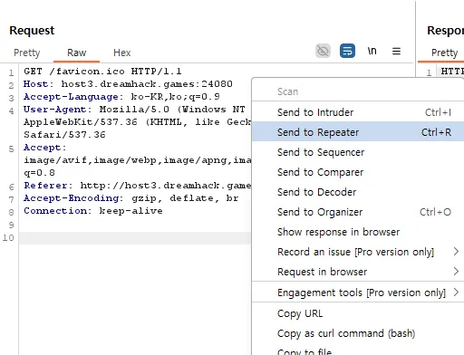 Request 창 우클릭 후 Send to Repeater 를 클릭한다.