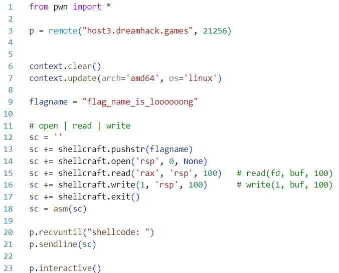 - orw 쉘 코드를 작성하고 shellcode 로 전달한다.