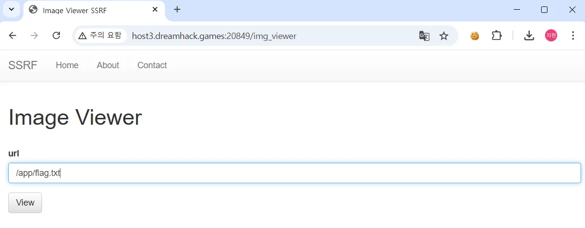 flask로 작성된 image viewer 서비스 입니다. SSRF 취약점을 이용해 플래그를 획득하세요. 플래그는 /app/flag.txt에 있습니다. Reference Exercise: SSRF